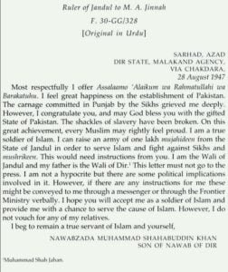 مَیں انتہائی احترام کے ساتھ آپ کو سلام پیش کرتا ہوں۔ پاکستان کے قیام پر مَیں بے حد خوشی محسوس کر رہا ہوں۔ پنجاب میں سکھوں کے قتلِ عام نے مجھے بہت دکھ پہنچایا۔ تاہم، میں آپ کو مبارک باد پیش کرتا ہوں اور خدا آپ کو پاکستان کی تحفہ شدہ ریاست سے نوازے۔ غلامی کا طوق ٹوٹ چکا ہے۔ اس عظیم کام یابی پر ہر مسلمان بجا طور پر فخر محسوس کر سکتا ہے۔ میں اسلام کا سچا سپاہی ہوں۔ میں ریاستِ جندول سے ایک لاکھ مجاہدین کا لشکر اسلام کی خدمت اور سکھوں اور مشرکین سے لڑنے کے لیے اُٹھا سکتا ہوں۔ اس کےلیے آپ سے ہدایات درکار ہوں گی۔ میں جندول کا والی ہوں اور میرے والد ریاستِ دیر کے والی ہیں۔ یہ خط پریس تک نہیں جانا چاہیے۔ میں منافق نہیں ہوں لیکن اس میں کچھ سیاسی مضمرات شامل ہیں۔ تاہم، اگر میرے لیے کوئی ہدایات ہیں، تو وہ مجھے میسنجر کے ذریعے یا وزارتِ سرحد کے ذریعے زبانی طور پر پہنچائی جا سکتی ہیں۔ مجھے امید ہے کہ آپ مجھے اسلام کے سپاہی کے طور پر قبول کریں گے اور مجھے اسلام کی خدمت کا موقع فراہم کریں گے۔ تاہم، میں اپنے کسی رشتہ دار کی ضمانت نہیں دیتا۔