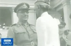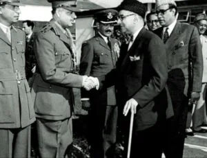 پاکستان کے سابق وزیرِ اعظم لیاقت علی خان اور میجر جنرل اکبر خان ایک تقریب میں مصافحہ کرتے ہوئے