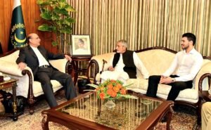 عظیم شبیر بلور اپنے دادا غلام احمد بلور کے ہمراہ صدرِ مملکت آصف علی زرداری سے ایوانِ صدر اسلام آباد میں ملاقات کر رہے ہیں۔