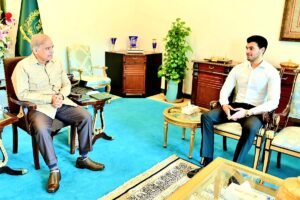 عظیم شبیر بلور وزیرِ اعظم میاں محمد شہباز شریف سے ملاقات کر رہے ہیں۔